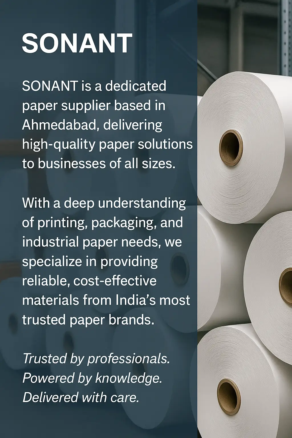 SONANT is a dedicated B2B paper supplier based in Ahmedabad, delivering high-quality paper solutions to businesses of all sizes. With a deep understanding of printing, packaging, and industrial paper requirements, we specialize in providing reliable, cost-effective materials sourced from India’s most trusted paper brands.